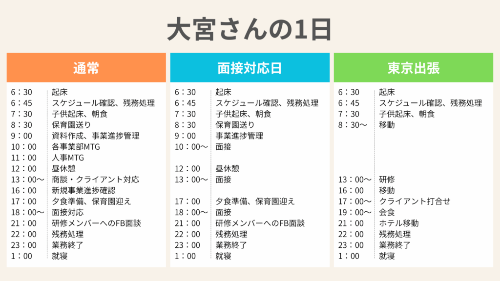 大宮さんのスケジュールは「通常」「面接日」「出張日」で大きく変わります。